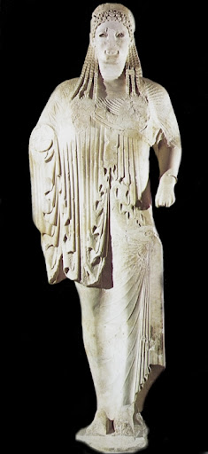 rzeźba archaiczna były to blokowe, uproszczone bryły przedstawiane frontalnie, o statycznej kompozycji i często symetryczne - wyprostowana sylwetka o sztywnej pozie pozwalała na uchwycenie osi symetrii. rzeźba wczesnogrecka powinna kojarzyć się pojęciami kurosów i kor, czyli młodzieńców i dziewcząt przedstawianych w ten frontalny, statyczny sposób, o idealnych, młodych twarzach, zgrabnych, zdrowych sylwetkach i lekkich, tajemniczych uśmiechach. obie te postaci uznaje się za greckie idole, podlegały one ścisłemu kanonowi - kurosów zawsze przedstawiano nagich dla ukazania piękna ciała, kory zaś zawsze ubrane dla zachowania przyzwoitości. warto zauważyć podobieństwo pozy kurosa do rzeźb egipskich.