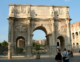 tak jak łuk tytusa był jednoprzeloty, łuk konstantyna to już łuk trójprzelotowy - posiadający trzy przejścia. wynikiem faktu, że łuk ten pochodzi z późniejszego okresu jest umiejscowienie reliefów także na fasadzie łuku. został zbudowany dla uhonorowania dziesięciolecia sprawowania władzy przez cesarza konstantyna oraz dla uczczenia jego zwycięstwa nad maksencjuszem  (spór o władzę po śmierci konstancjiusza chlorusa), do czego nawiązują rzeźby i reliefy przedstawiające lata rządów narracją kontynuacyjny oraz medaliony.